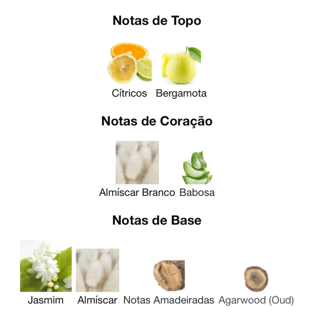 As notas de fundo são: Jasmim, Almíscar, Notas Amadeiradas e Agarwood (Oud).
