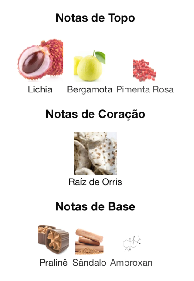 A característica principal está no equilíbrio entre a doçura frutada, a sofisticação floral e um fundo quente e cremoso, resultando em uma assinatura moderna e memorável.